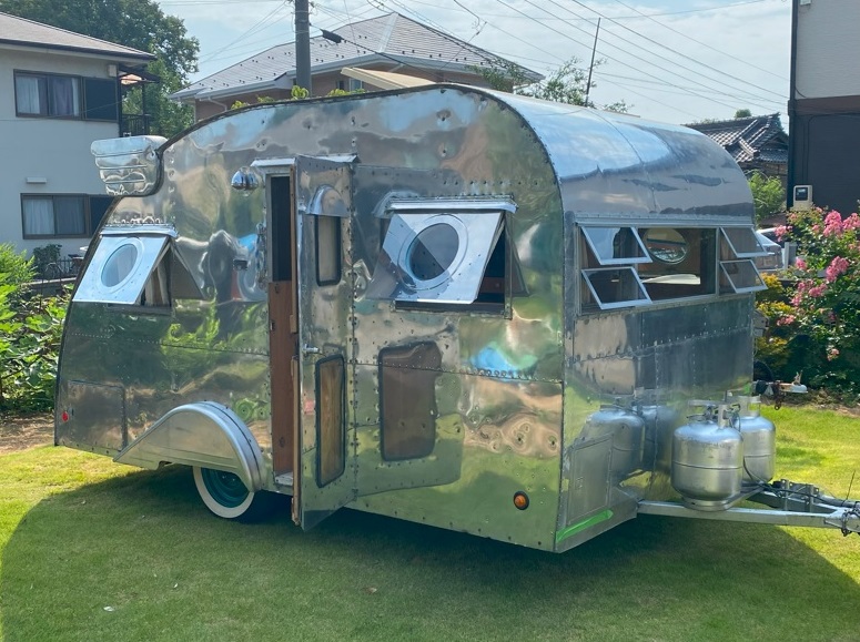 その後、カルフォルニアで前オーナーによるオーバーホールと、舷窓、翼、フェンダースカート、リアラックが追加取り付けされ世界で一台のキャンピングトレーラーが完成しました。どこへ行っても注目され皆からドアをノックされ中を見せるように頼まれた様です。